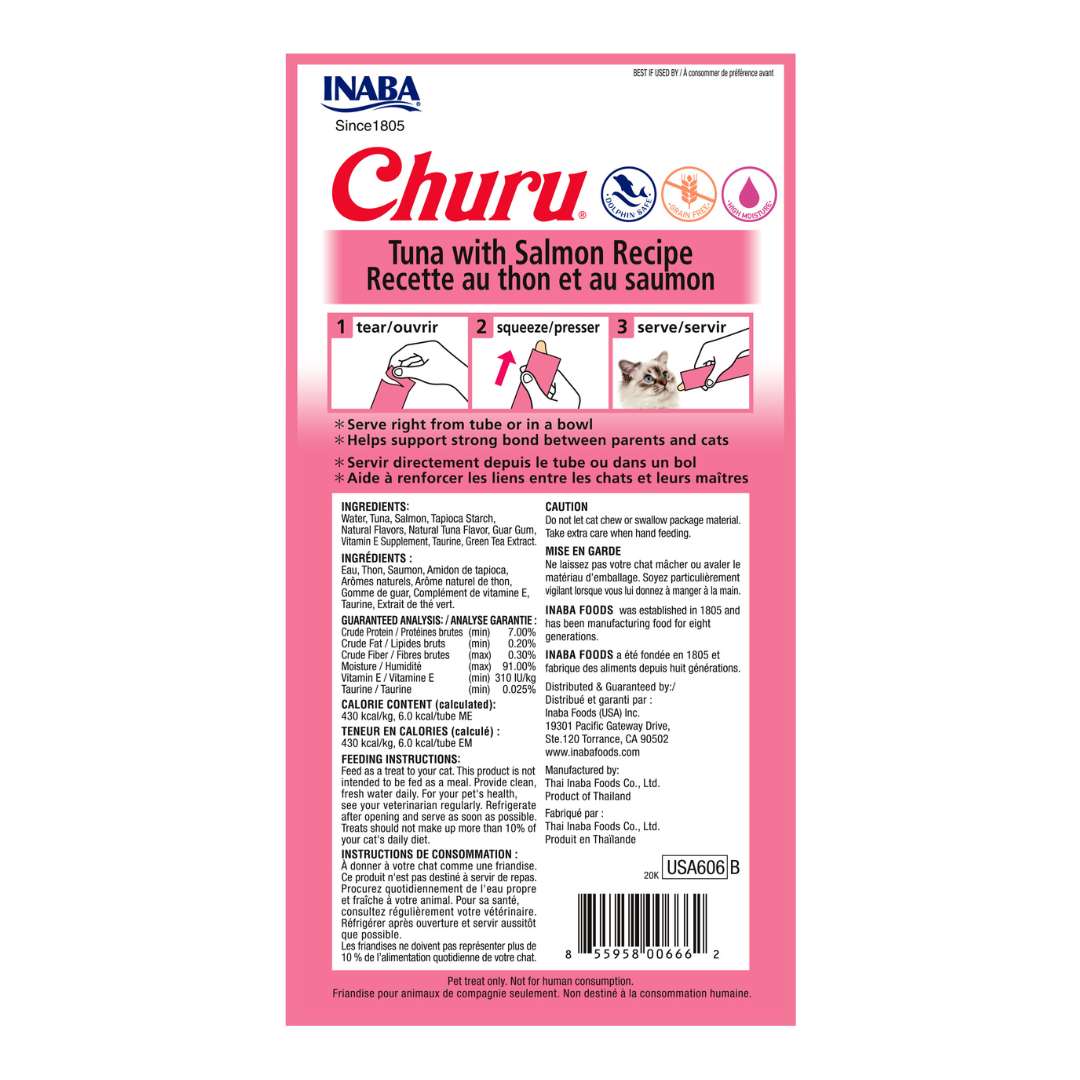 ¡Los treats Churu para gatos es elaborado con atún silvestre y salmón del pacifico! Disponibles en nueve variedades deliciosas, los Churu Purés tienen el alto contenido de humedad necesario para la salud de los felinos. Simplemente rasgue un tubo y apriételo un poco para alimentar a tu gato desde la mano. También puedes verterlo en un plato o añadirlo por encima de alimentos húmedos o secos.