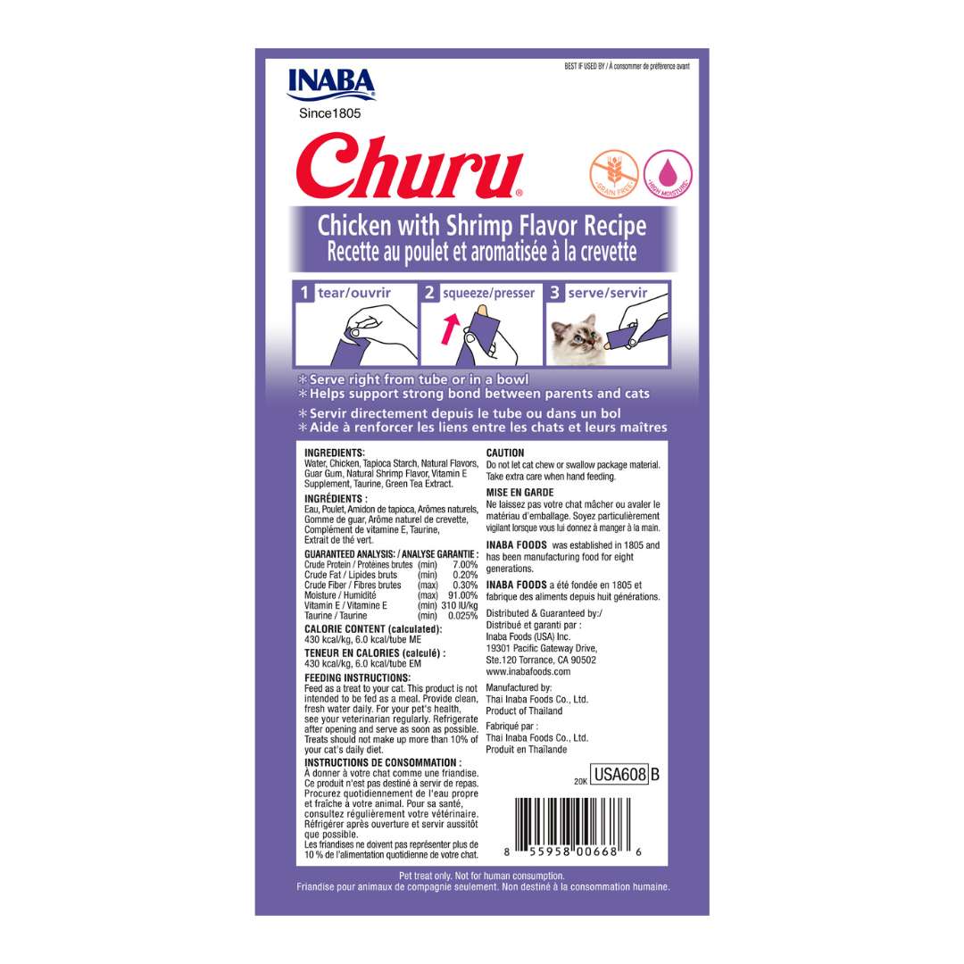 ¡Los treats Churu para gatos es elaborado con pollo criado en granjas! Disponibles en nueve variedades deliciosas, los Churu Purés tienen el alto contenido de humedad necesario para la salud de los felinos. Simplemente rasgue un tubo y apriételo un poco para alimentar a tu gato desde la mano. También puedes verterlo en un plato o añadirlo por encima de alimentos húmedos o secos.