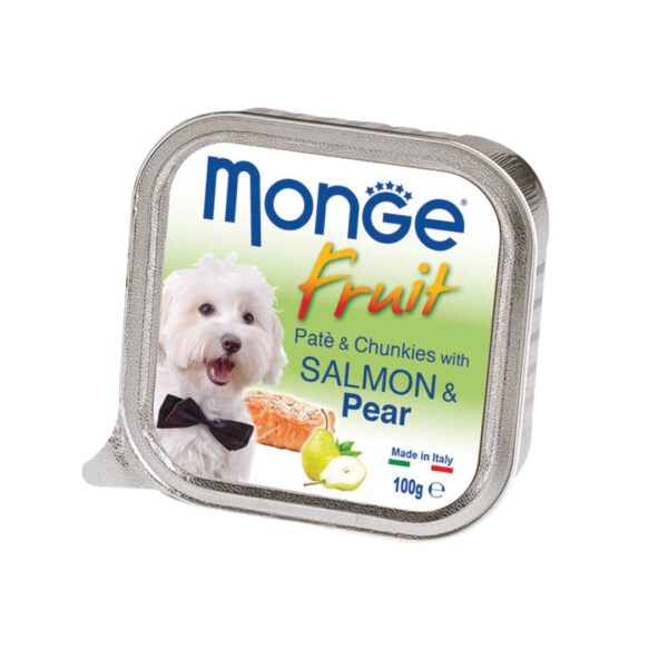 Alimento completo y digerible estudiado para la dieta equilibrada de perros adultos. Suave y sabroso, con trozos de salmón y pera, tiene una textura firme y un aroma agradable. Carne fresca 50%, pescado fresco 50% (de los cuales salmón min. 10%), pera 4%, minerales, vitaminas.